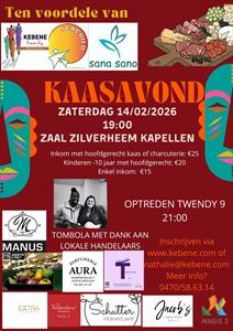 Op zaterdag 14 februari 2026 organiseren we opnieuw onze gezellige Kaasavond ten voordele van Kebene, Sunchild & Sana Sano. We nodigen iedereen van harte uit in Zaal Zilverheem in Kapellen voor een avond vol sfeer, lekkere kazen, charcuterie en fijne muziek.